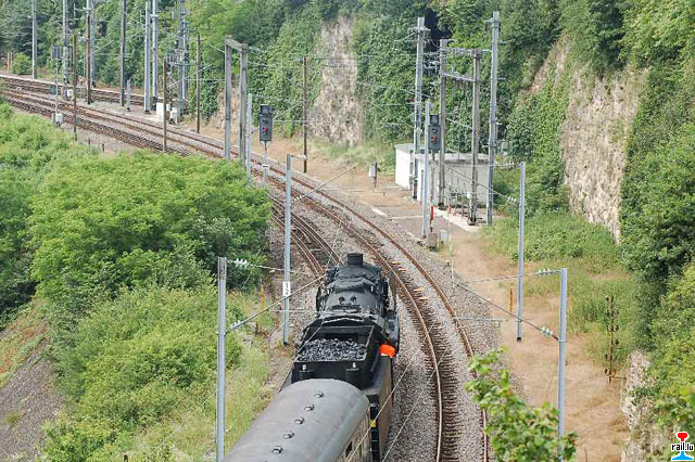 Le train spécial avec les locomotives à vapeur AMTF ANNA N°9 et AMTF T3 quitte la ligne du Nord à la sortie d'Ettelbruck pour emprunter la voie de la ligne de l'Attert (Photo: