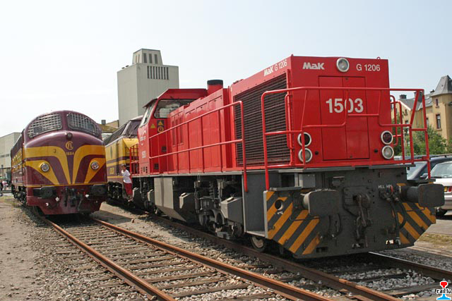 Exposition à la gare d'Ettelbruck lors des Festivités des 100 ans de la Ville d'Ettelbruck: locomotives diesel ex-CFL 1604 et CFL-Cargo 1505 (Photo: