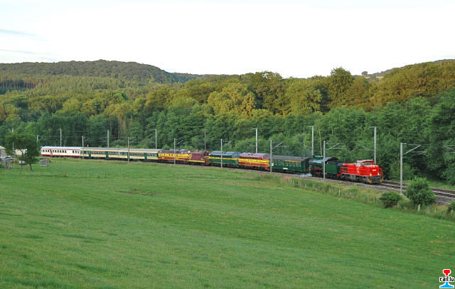 La locomotive électrique SNCB 2369 tire les 2 locomotives diesel PFT 1603, 202020 (ex-CFL 1602) et la locomotive à vapeur PFT 64.169 de Ciney à Ettelbruck, ici à Marloie (Photo: 2.6.2007 Nico