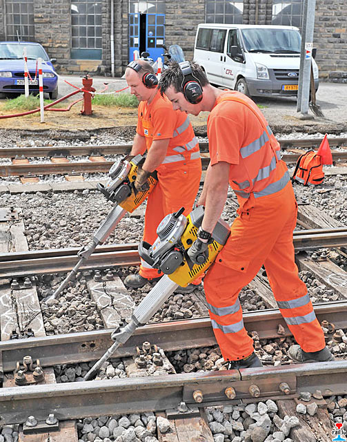 CFL-Gleisarbeiter führen ihr Handwerk vor (Photo: 9.5.2009 Francis Wagner)