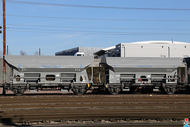 7 wagons à 2 essieux à déchargement contrôlé bilatéral Fcs de Ferro-Tech FT 4: 23 RIV 82 L-TTG 6450 259-8 Fcs; FT 5: 23 RIV 82 L-TTG 6451 004-7 Fcs; FT 6: 23 RIV 82 L-TTG Fcs; FT 7: 23 RIV 82 L-TTG 6451 049-2 Fcs; FT 1: 23 RIV 82 L-TTG 6450 246-5 Fcs; FT 2: 23 RIV 82 L-TTG 6451 058-3 Fcs; FT 3: 23 RIV 82 L-TTG 6450 256-4 Fcs à Belval-Usines (Photos: