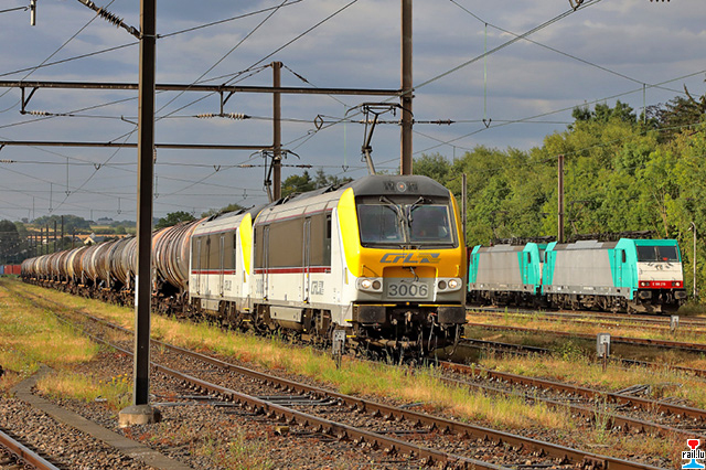 Zu Athus an der Gare, eng Parallel tescht enger UM 3000 (3006 an 3014) mat engem Zetärenzuch fir an d'Stad an eng UM 186 vun Alphatrain di fir Railtraxx fueren an e Containerzuch aus dem Containerterminal Athus op Antwerpen brengen (Photo: 3.8.2020 Yves Gillander)