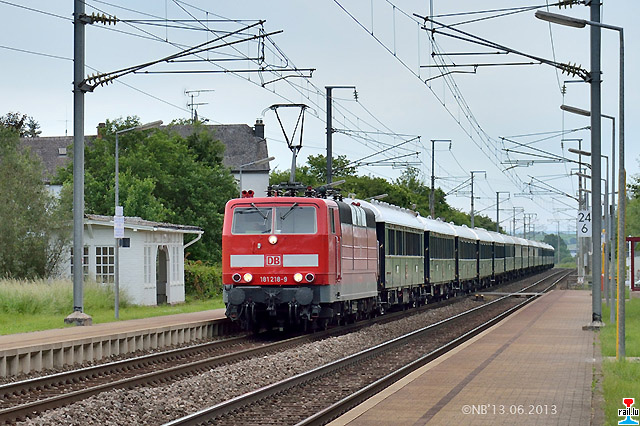 Wegen eines Streiks bei der SNCF wurde am 13.06.2013 der Venice Simplon Orientexpress (VSOE) nach Ostende über Deutschland und Luxemburg umgeleitet. Hier passiert der 16 Wagen zählende Prestigezug am Haken der DB 181 218-9 den Haltepunkt Betzdorf. (Foto: Nico Berté, 13.06.2013)