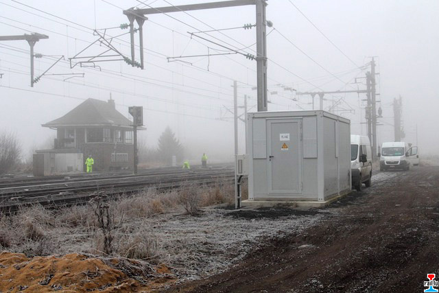 La cabine B18 située côté Luxembourg est hors service. Le bâtiment à droite renferme les nouvelles installations.  Les agents d'Infrabel effectuent les travaux.  (Photo:  01.12.2012 Mercatoris Nico)