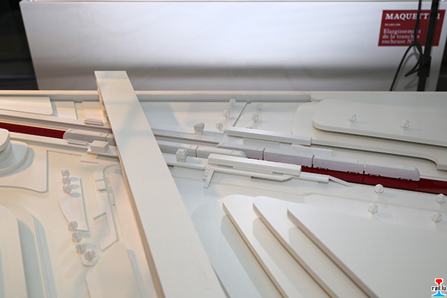 Maquette du nouvel arrêt Sandweiler-Contern, en-dessous du pont routier, à voir dans le pavillon d'exposition EXPO+ informant le public sur le chantier de la mise à double voie du trançon ferroviaire de Luxembourg à Sandweiler-Contern (Photo: 9.3.2015 jmo)