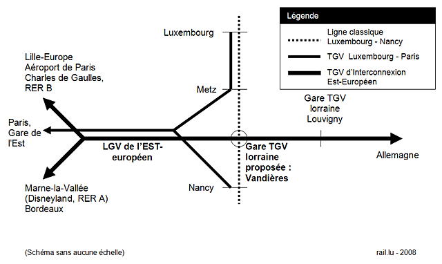 (Pour les alinéas suivants, merci de vous référer au schéma joint : Correspondances à partir de Luxembourg avec les TGV d’Interconnexion par une gare lorraine à Vandières, en complément des TGV se rendant directement de Luxembourg à Paris (Gare de l’Est)