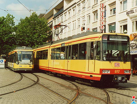 Rame VBK 237 et rame bivalente DB 405 001-3 (No AVG 817) à Karlsruhe-Marktplatz