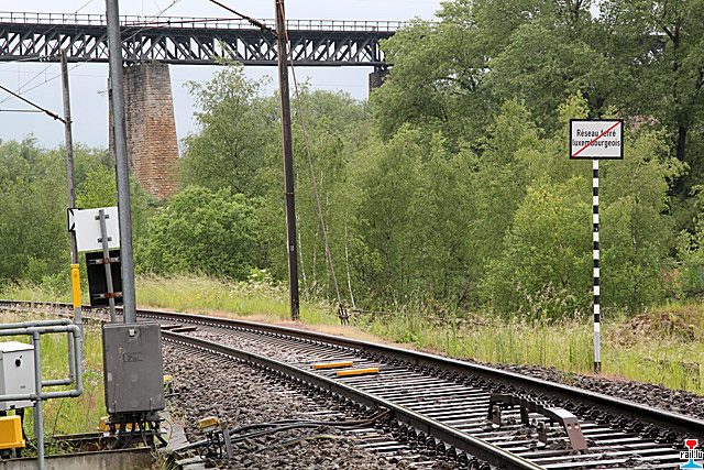 Frontière Luxembourg - France, au fond le viaduc de la ligne