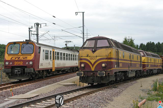 Elektrotriebwagen CFL  2012 zwischen Bascharage und Schouweiler, CFL - Diesel Loks 1807 und 1820  warten mit leerem Sandzug bei Luxguard in Bascharage (Foto: 7.7.2007 jmo)