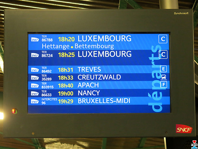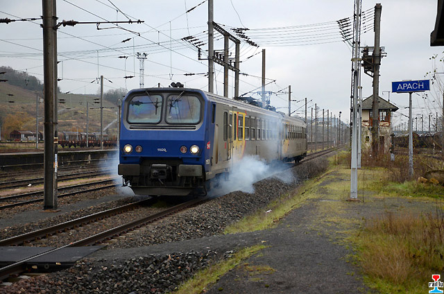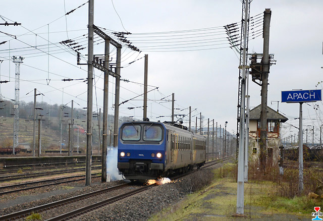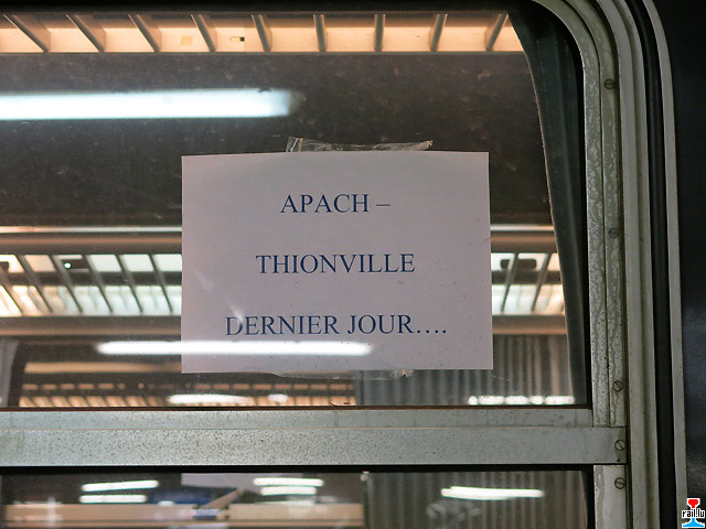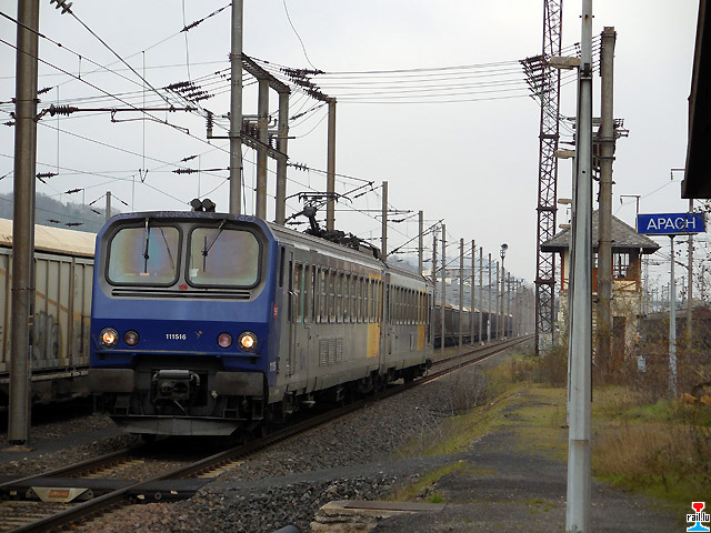 Changement d'horaire du 15.12.2013: Suppression des trains TER SNCF entre Thionville et Apach. Les 2 paires de trains circulant les weekends et jours fériés Trier-Apach-Thionville-Metz et v.v. sont maintenues et desservent dorénavant tous les points d'arrêts entre Apach et Thionville (sauf le train de soirée Metz-Trier, desservant cependant Sierck et Apach) - NM