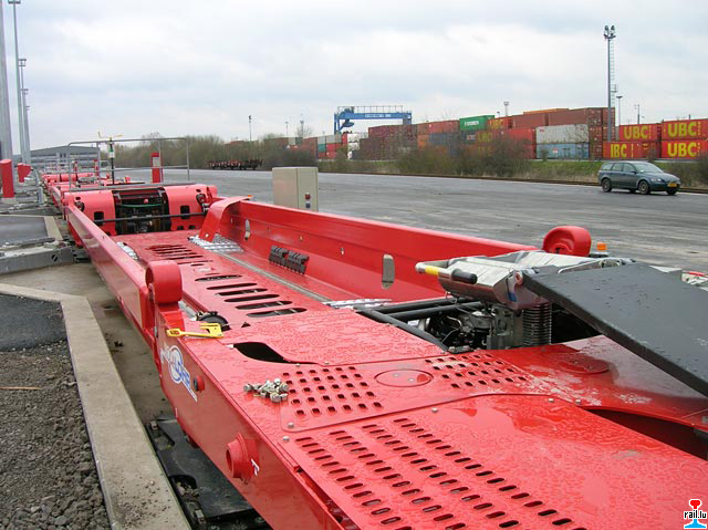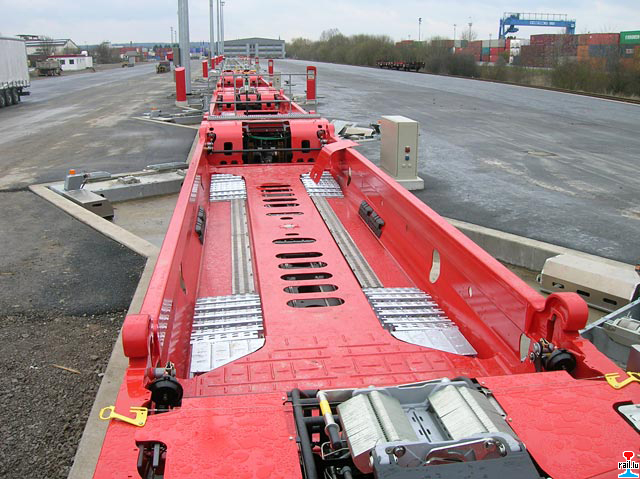 Doppelwagen in das Lorry-Rail Terminal. Die Endwagen eines Halbzuges sind mit UIC Standardkupplungen versehen und können mit einer Lokomotive verbunden werden. - Un train Lorry-Rail complet, composé de 20 wagons