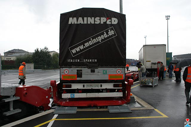 Auf dem Zug der ersten kommerziellen Lorry-rail - Fahrt, waren LKW-Sattelanhänger aus 6 verschiedenen Ländern: Frankreich, Dänemark, Deutschland, Luxemburg, Schweden, Spanien (Photo: 10.9.2007 jmo)