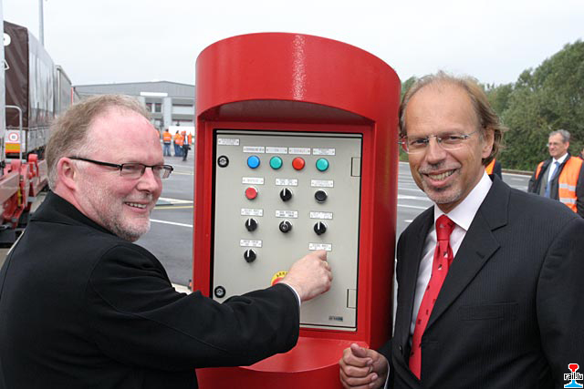 Erste kommerzielle Fahrt der Eisenbahnautobahn Luxemburg - Perpignan, hier beim Startschuss in Bettemburg / Luxemburg, mit Transportminister Lucien Lux und Lorry-Rail Generaldirektor Nicolas Welsch (Photo: 10.9.2007 jmo)