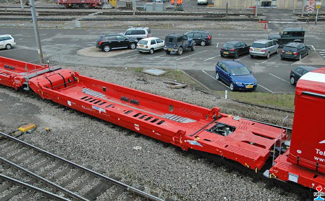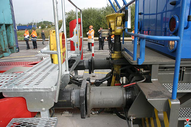Les wagons intermédiaires de chaque demi-rame sont reliés entre eux à l'aide d'un attelage central spécial - Die Zwischenwagen eines Halbzuges sind mit einer leichteren Spezialzentralkupplung untereinander verbunden. Da die Zwischenwagen dadurch leichter sind als die Endwagen, besitzen die Zwischenwagen eine etwas höhere Ladekapazität. Ein Spezialprogramm verteilt die abgewogen LKW-Sattelanhänger auf die 20 Doppelwagen. (Photo: 10.9.2007 jmo)