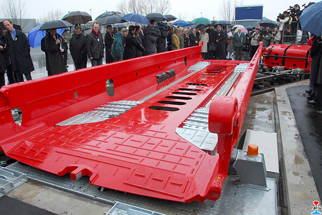 Le ministre des transports luxembourgeois M. Lucien Lux (1er à d.) et son homologue français M. Dominique Perben (2e à d.) se font expliquer le mode de fonctionnement des wagons à plancher bas pivotant Modalohr (Photo: 29.3.2007 Francis Wagner)