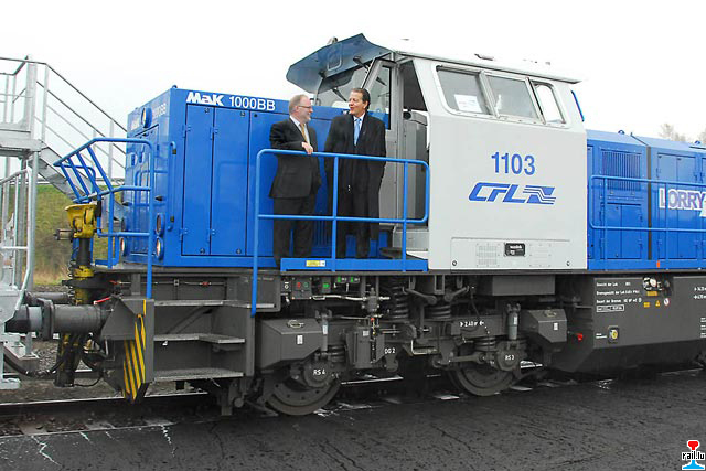 Le ministre des transports luxembourgeois M. Lucien Lux (g.) et son homologue français M. Dominique Perben sur la locomotive de manoeuvre CFL 1103 du train inaugural - Der luxemburgische Transportminister H. Lucien Lux (l.) und der französische Transportminister H. Dominique Perben (Photo: 29.3.2007 Francis Wagner)