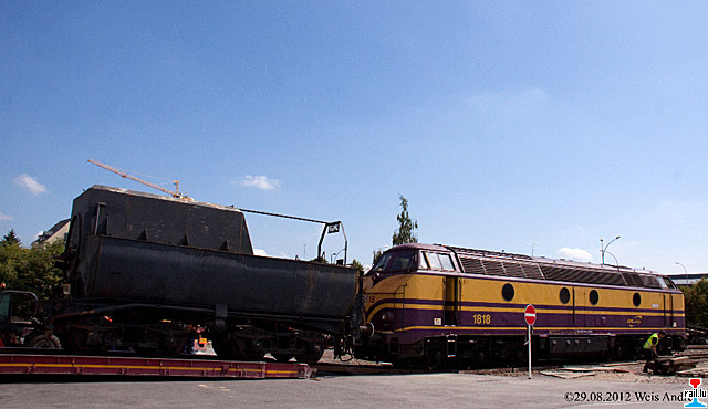 La CFL cargo 1818 aide lors du chargement de la locomotive à vapeur SSMN 5621 pour le transfert par route au Fond-de-Gras (Photos: 29.8.2012 Änder Weis)