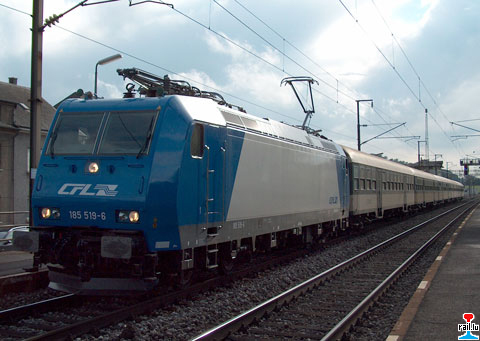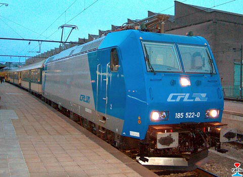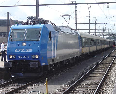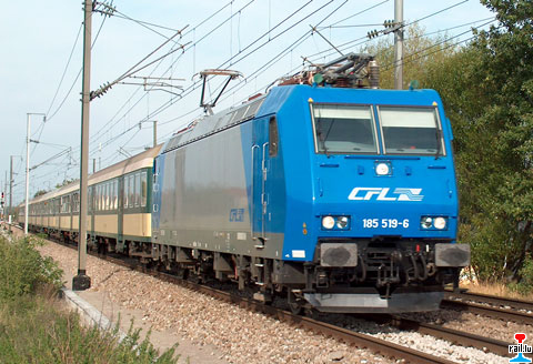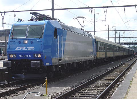 Die CFL Mietlok 185 519-6 vor dem Personenzug