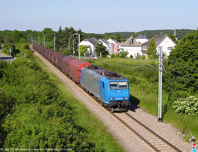 CFL-Mietlok 185 523 mit Güterzug in Moutfort (Photo:17.6.2006 Mike Wohl)
