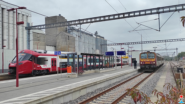 Déi nei CFL - Automotrice 2421 an d'CFL - Automotrice 2022 an der Klengbettener Gare. (Photo: 12.10.2025 Romain Schwartz)