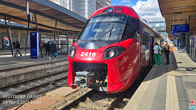 Zanter läschter Woch ass och schon de 2418 bei der CFL ënnerwee. D'Läscht Woch war en op der Kléngbetten - Arel - Streck ennerwee. Hei ass eng Foto wou en um Quai 2 an der Gare Lëtzebuerg steet, fir op Arel. (Photo: 25.4.2025 Romain Schwartz)
