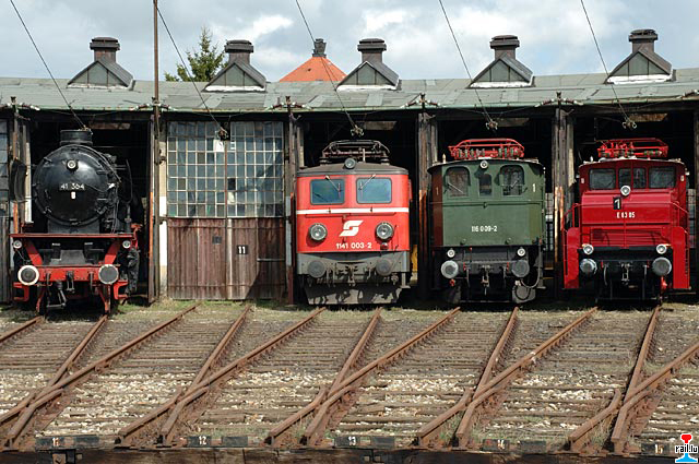 Die Dampfolk 41 364, die ÖBB-E-Lok 1141 003-2, die E-Lok 116 009-2 / E 16 09 / ex bayrische ES 1 und die E 63 05 im "Rundhaus Europa - Drehscheibe der Kulturen" im Bahnpark Augsburg (Foto: 17.4.2006 © hkl - www.hklnet.de)