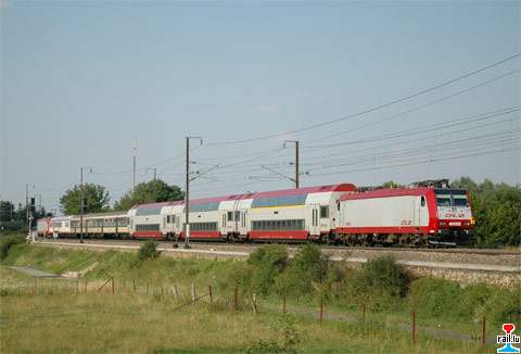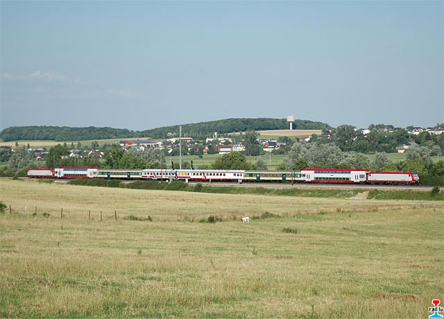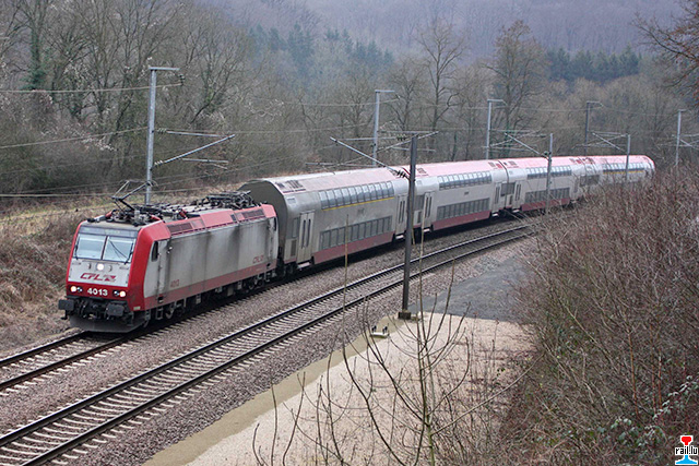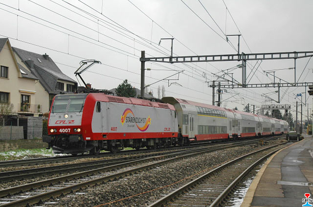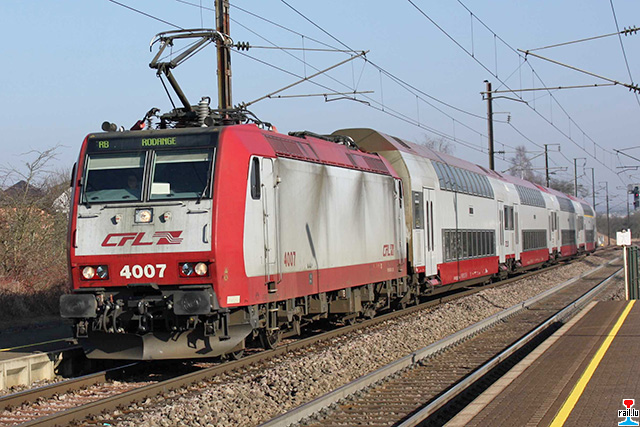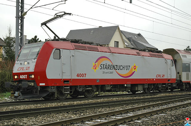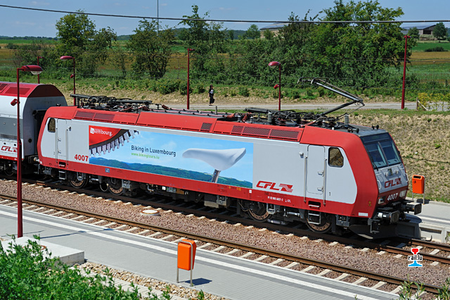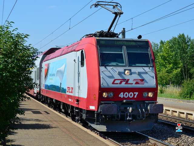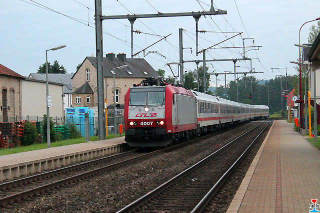 Suite à l'indisponibilité d'une BR 181.2 pour effectuer les trains IC132 (du 14.06.2013 ) et IC131 du 15.06 , c'est une CFL 4000 qui s'est chargée de la traction. Ici l'IC 131 avec la 4007 en tête à Roodt / Syre (Photo: 15.6.2013 Loïc Mottet)