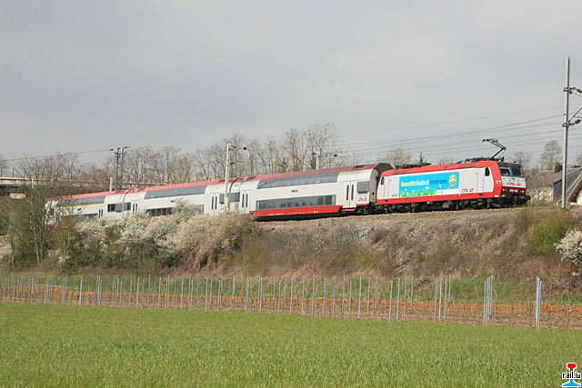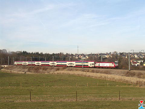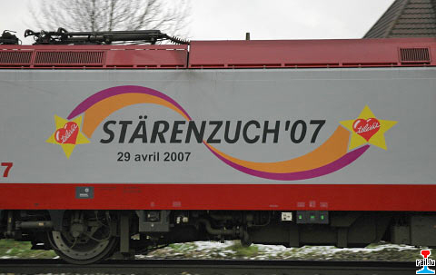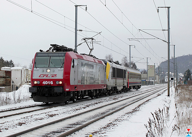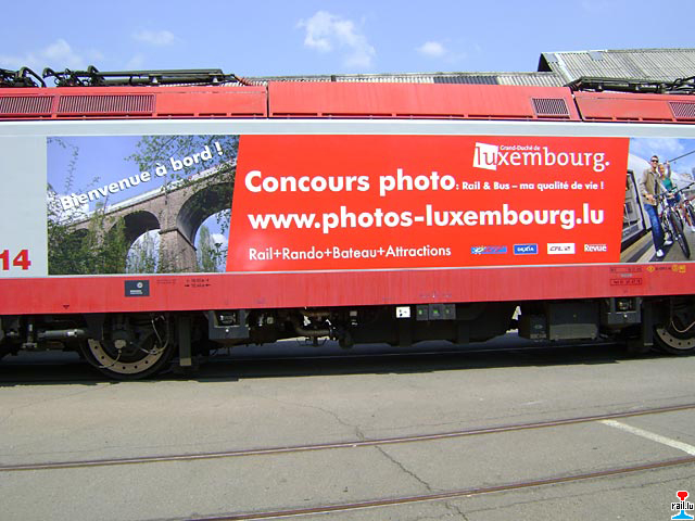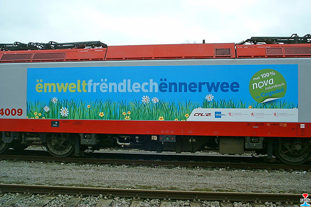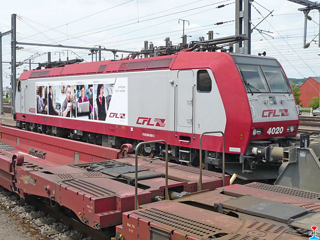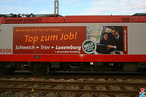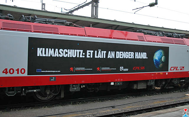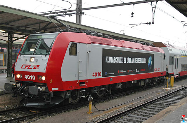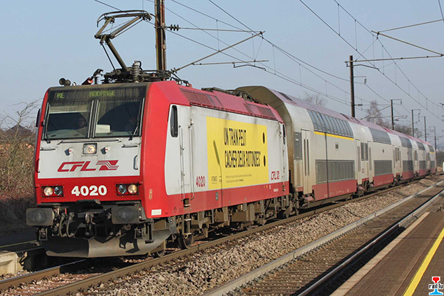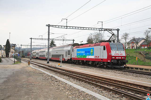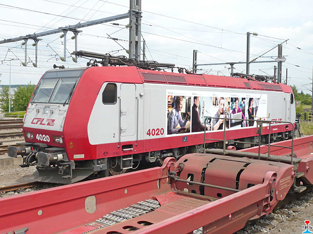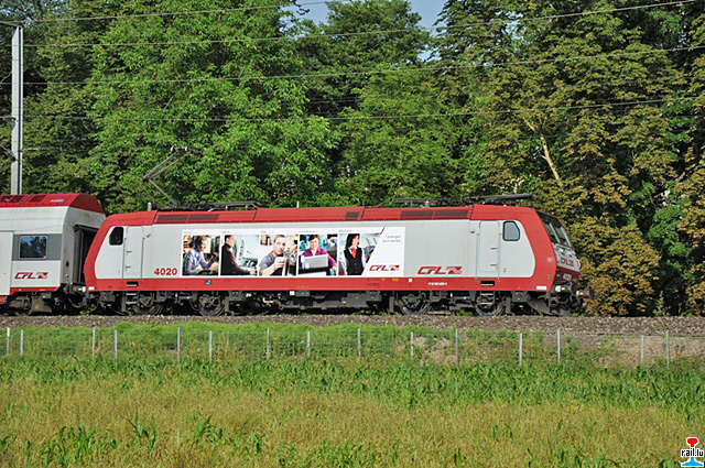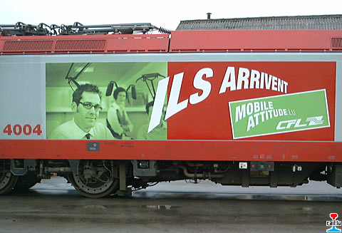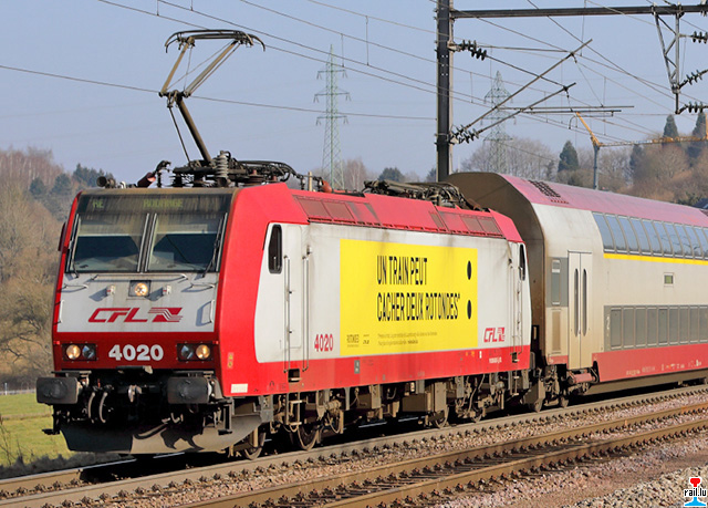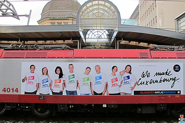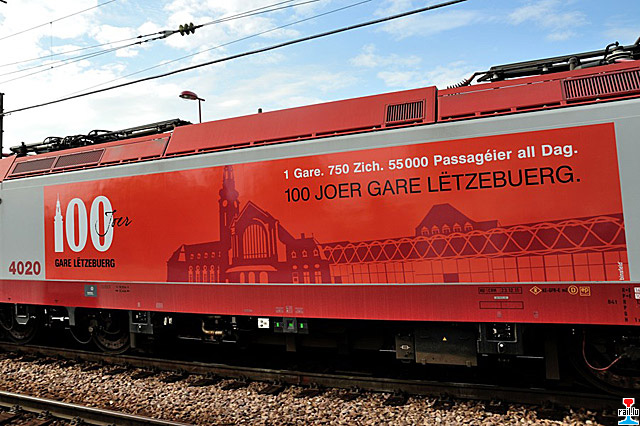 D'4020 ass zënter kuerzem mat enger Reklamm ennerwee déi d'Leit animéiren soll mam Zuch an d'Stader Rotonden ze kommen: "Un train peut cacher deux rotondes" nennt sech dat dann. D'Foto ass vu Bieles. (Photo: 13.2.2017 Yves Gillander)