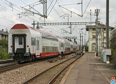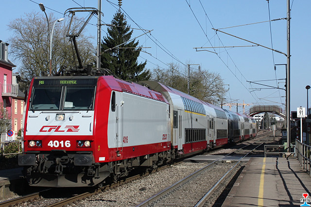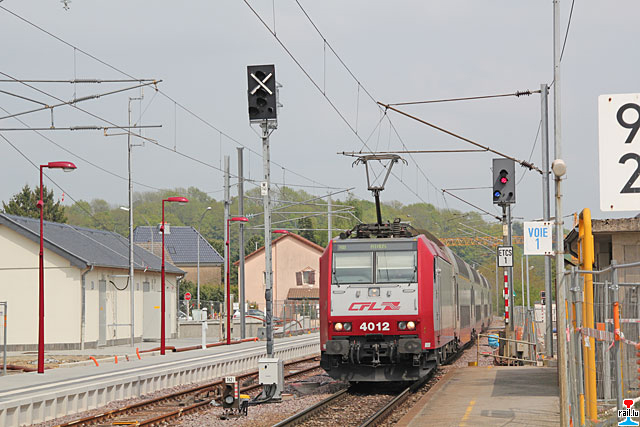 CFL 4016 mat énger Rame Dosto'en zu Schëffleng - d'Barrière (PN 91), do an och die anner Saït vun der Gare sollen jo an der Métt durch éng Bréck ënnert der Bunn ersaat ginn, - am Hannergrond d'Fossgängerbréck (Photo: 12.3.2015 Guy Pettinger)