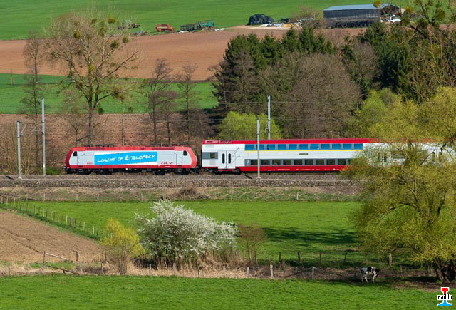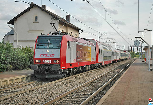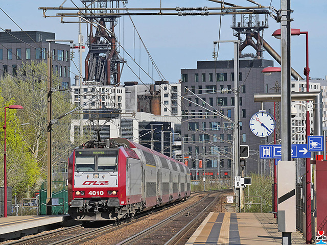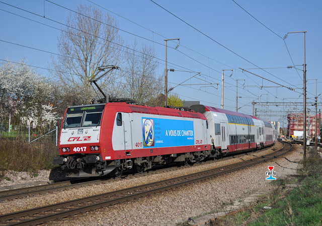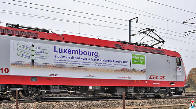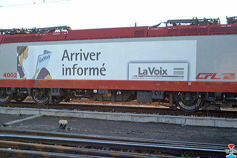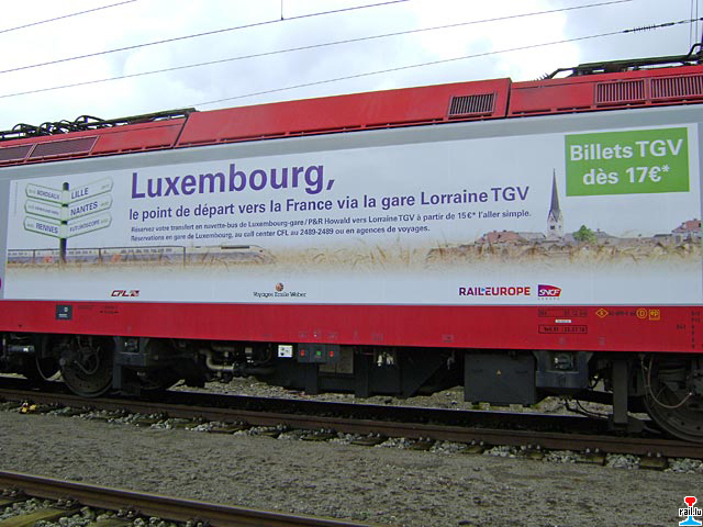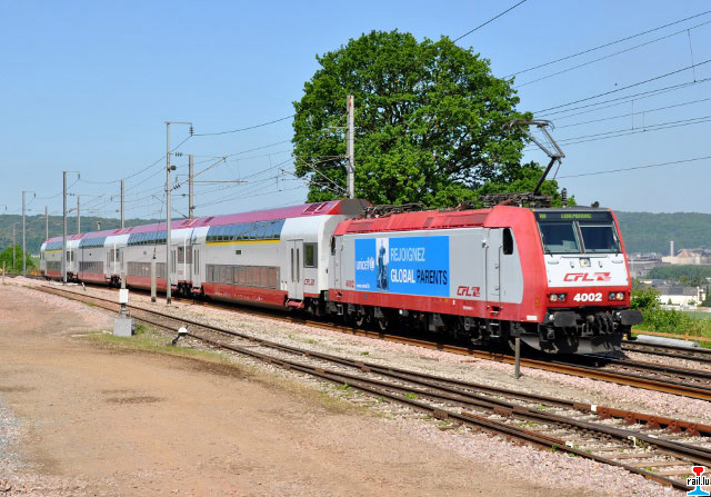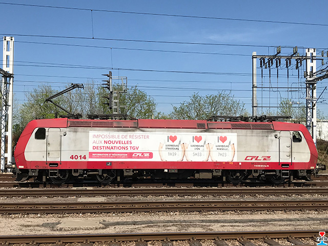 CFL 4014 avec pub "IMPOSSIBLE DE RESISTER AUX NOUVELLES DESTINATIONS TGV: Luxembourg - Strasbourg: 1h39; Luxembourg - Lyon: 5h33; Luxembourg - Marseille: 7h23" à Rodange (Photos: 19.4.2018 jmo)