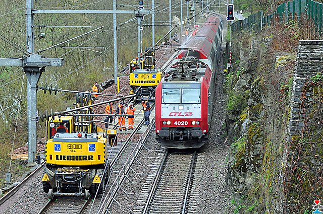 D'4020 'un train peut cacher deux rotondes' (ein Zug kann zwei Rundschuppen verdecken) fir die 2 Rotonden an der nördlecher Ausfaart vun der Staadter Gare (Photo: 15.2.2017 Guy Pettinger)