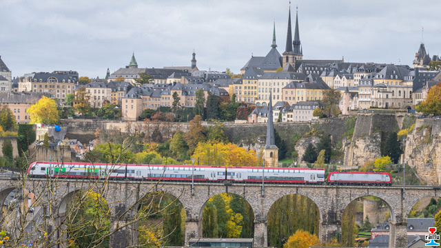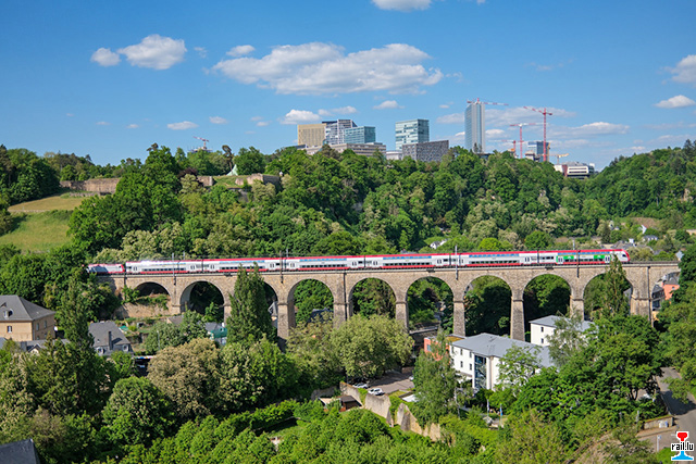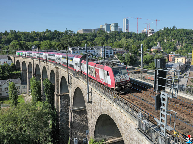 Eng 4000er mat CFL « Dostoen » um Clausener Viaduc virun der eenzegarteger Kuliss vun der Alstad. (Photos: 23.10.2025 kuerz virun 12h30 Marc Wirtor)