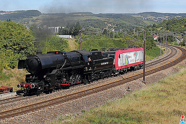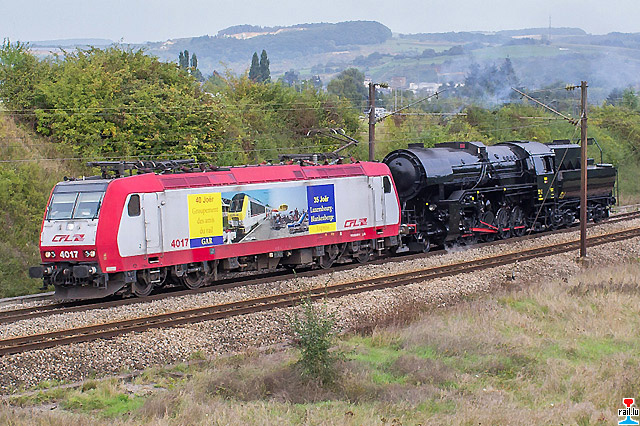 La locomotive à vapeur CFL 5519 acheminée par la CFL 4017 depuis Schweinfurt passe à Mertert. L'absence de PZB 90 ayant rendu impossible un transfert de la 5519 par ses propres moyens. Rückführung der CFL-Dampflokomotive