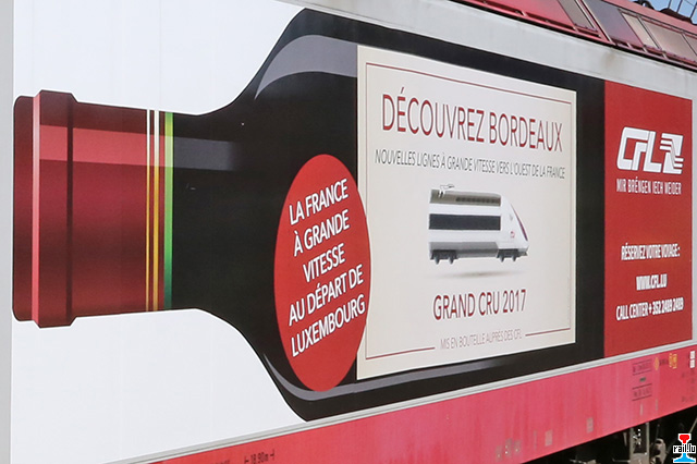 Nouvelle publicité sur la locomotive CFL 4018: La France à grande vitesse au départ de Luxembourg - Découvrez Bordeaux Grand Cru 2017 - Mis en bouteille auprès des CFL - Nouvelles lignes à grande vitesse vers l'ouest de la France (Photos: 4.7.2017 jmo)