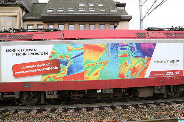 CFL 4007 avec pub "Technik erliewen - Technik verstoen - Wëssens - atelier Lëtzebuerg - www.wessens-atelier.lu" à Schifflange (Photos: 1.2.2018 jmo)