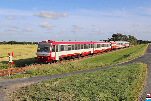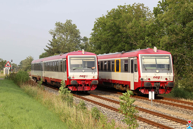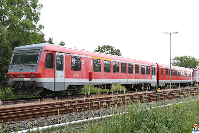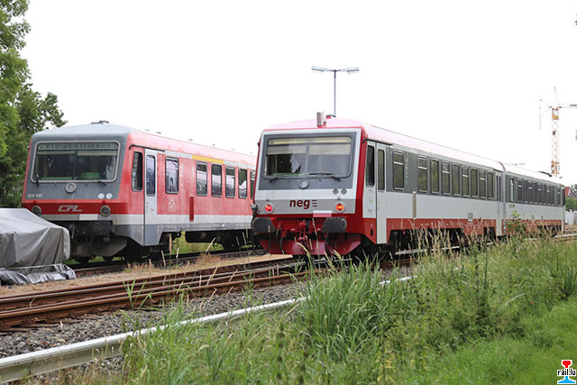 D'ex CFL - Trabbien zu Niebüll bei der neg. Den 505 ass zum 629 505 (neg VT 505) gin, deen anenren bleiwt als 628 506 (neg VT 506) bezeechent. Äusserlech ass den ex - CFL gutt ze erkennen, een huet keng 1. Klass an keng rout Schlussluuchten. Lënks d'ex CFL - Trabbi - Steierween 928 505 + 506 (Photos: 17.7.-19.07.2015 Armand Schmit)