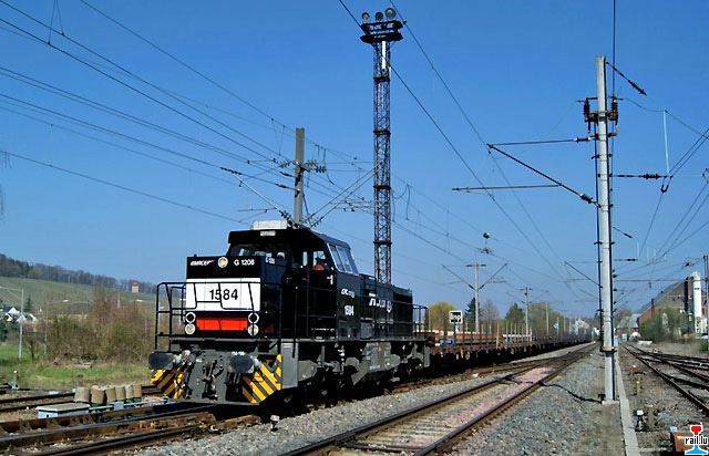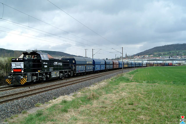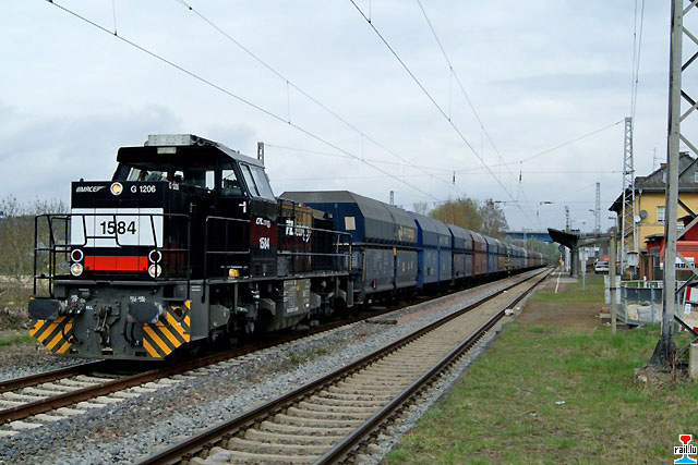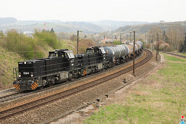 La locomotive Diesel CFL cargo 1584 avec le train 47226 à Apach (Photo: 29.3.2011 Séb Steiner)