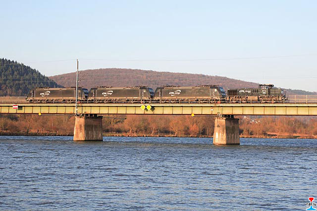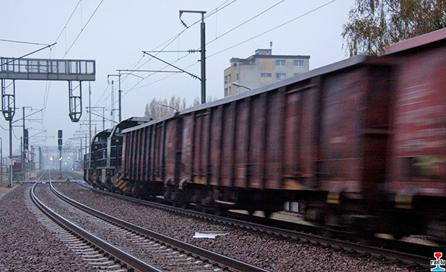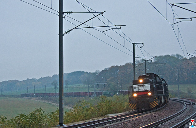 La 1587 descend vers Ebange avec une longue rame de wagons et les 3018 et 3005 en véhicule (Photo: 21.2.2012 Seb Steiner)