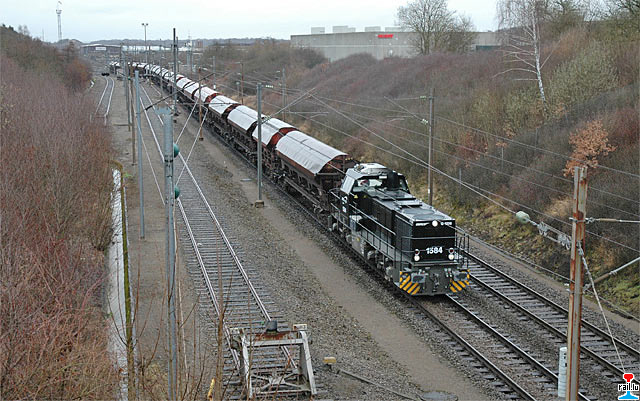 La locomotive Diesel CFL cargo 1584 avec le train 47226 avec sa rame de wagons PKP à Perl (Photo: 30.3.2011 Séb Steiner)