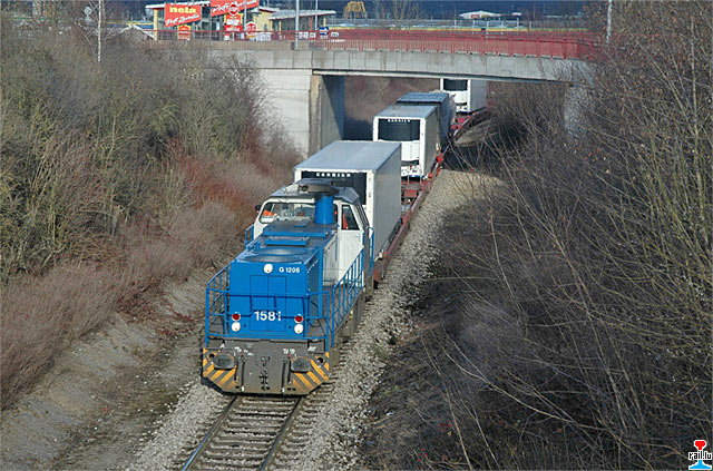 Locomotive CFL cargo 1581 avec une demi-rame Lorry - Rail à Bettembourg (Photo: