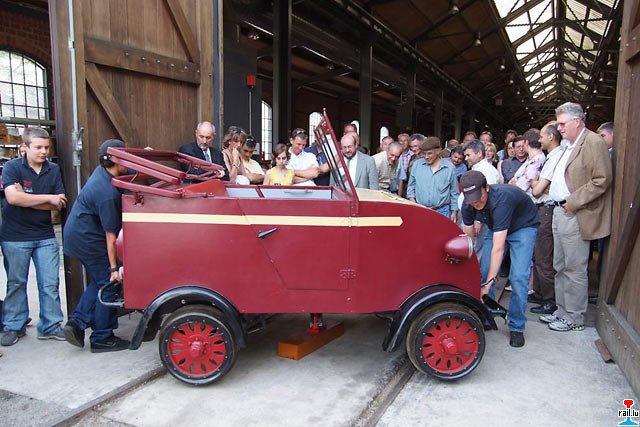 Inauguration officielle de la voiture PH No. 444, construite en 1926 par « La Brugeoise Nicaise et Delcuve » à La Louvière en Belgique, et restaurée par l'a.s.b.l. « Proactif » pour le compte du Train 1900, le 25 juillet 2007 au Fond-de-Gras. Au premier plan, une draisine d’inspection des voies, construite par « FKF-Werke» à Dresde (Allemagne) en 1942, également remise en état par «Proactif» dans ses ateliers du Fond-de-Gras. (Photo: