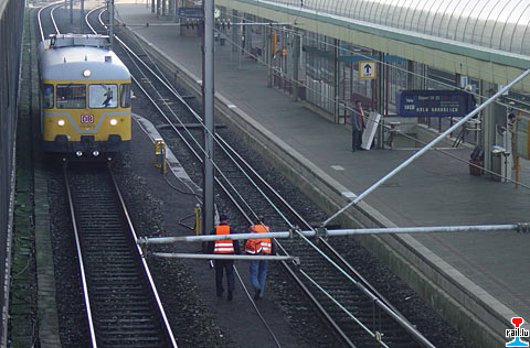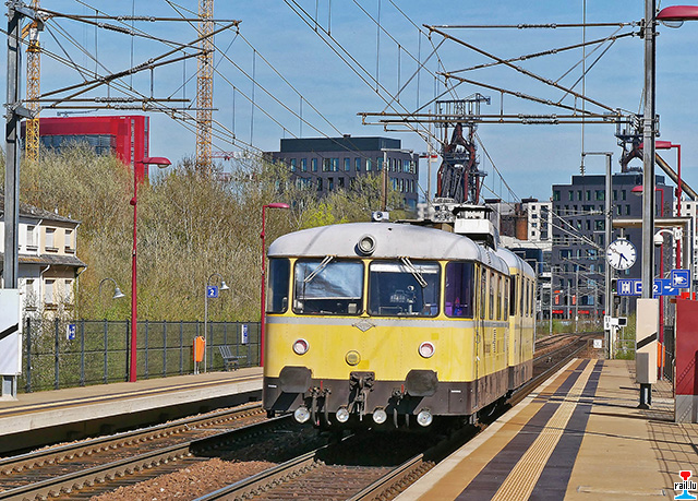 Le train de mesure de l'écartement de la voie de la DB parcourra les lignes luxembourgeoises du 04.04. au 07.04.2011 pour contrôler l'écartement. Ici, on le voit de passage en gare de Berchem. (Photos: 04.04.2011, ©Nico Berté)