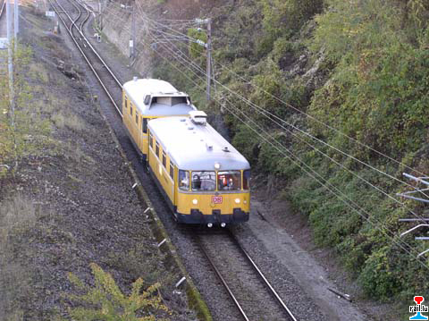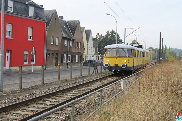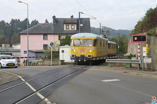 Den DB - Miesszuch VT 726 002 tëscht Beetebuerg a Volmerange-les-Mines: hei tëscht Dideléng - Stad an Dideléng - Centre. Bei senger Faart préift hie mat Ultraschll d’Qualitéit vun de Schinnen. (Photos: 7.10.2014 René Birgen)