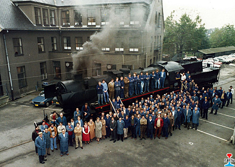 GAR Dampmaschin 5621 am Haf vum CFL Atelier zu Bouneweg (haut ass Rocade de Bonnevoie do), am Hierscht 1984, mat der Beleegschafft déi deemols do geschafft huet (Collection: Guy Jungbluth)