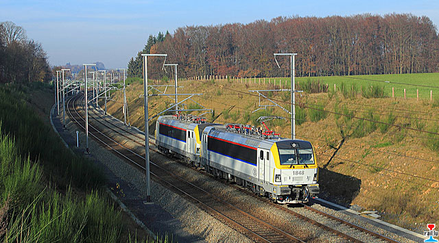 SNCB 1848 et 1849 sur un rodage Kinkempois - Kinkempois, passent à Hondelonge sur la ligne 162. (Photo: 21.11.2011 Yves Gillander)