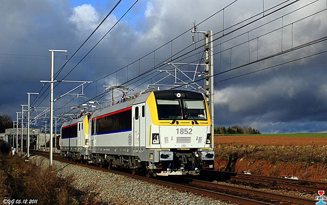 SNCB 1852 et 1854 passent à hauteur de l'ancienne gare internationale d'Autelbas. Elles circulent à contrevoie et vont entrer sur la ligne 167 dans quelques instants. (Photo: 5.12.2011 Yves Gillander)