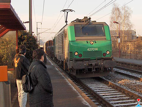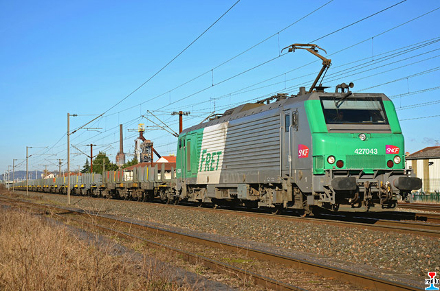 Uckange: La 27043 tracte ici une longue rame de wagons Arcelor-Mittal en direction du nord. Malheureusement, il n'y avait pas de 186 ECR en tête (Photo: 16.1.2012 Seb. Steiner)