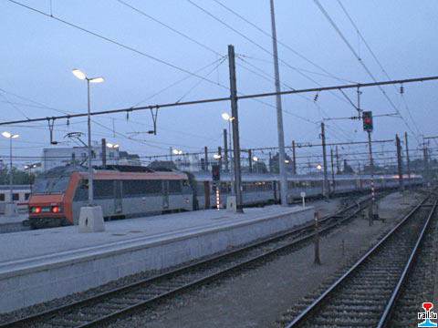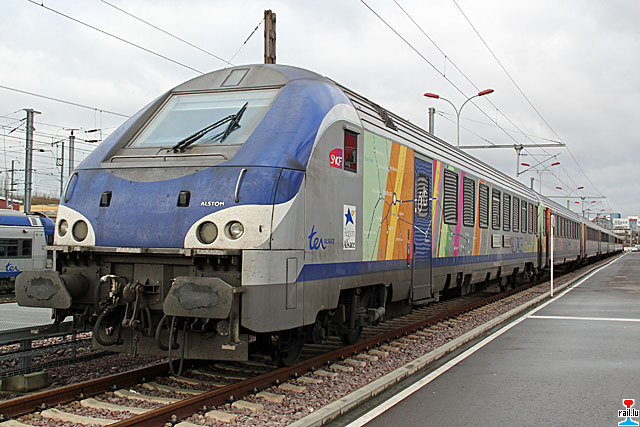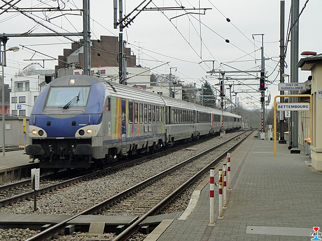 De Schnellzuch 295 Lëtzebuerg - Basel huet d'Voiture-pilote viir a Richtung Frankräich agët vun der 26000er gedrëckt (Photo: 28.2.2012 René Birgen)