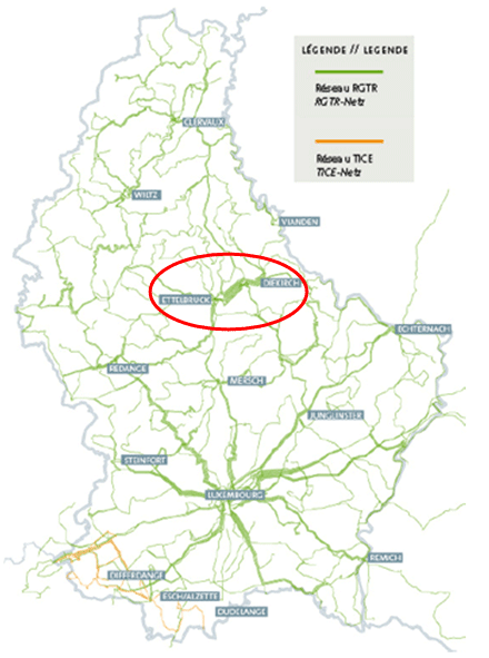 Carte du réseau d'autobus RGTR et TICE (Source: mobil 2020 - Mobilitéit déi beweegt - Ministère des Transports 2007)