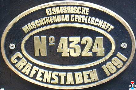 Plaque de construction sur la locomotive à vapeur T3 du INPA Elsässische Maschinenbau Gesellschaft GRAFENSTADEN No 4324 - 1891(Photo: jmo) |